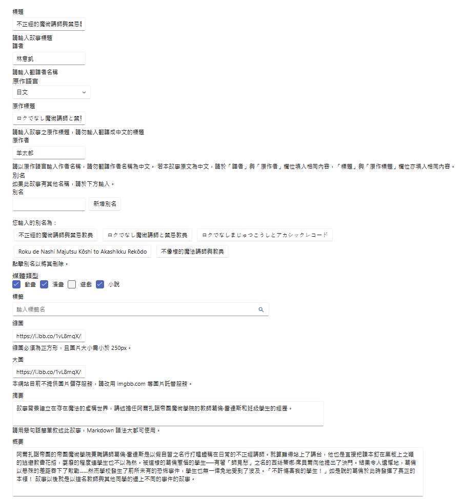 - 名稱、原作名稱、譯者、作者等上述欄位不可編輯。